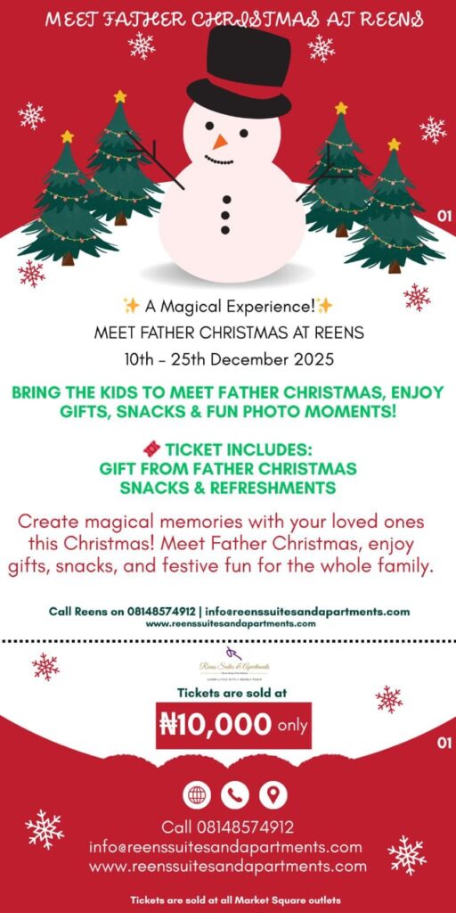 Meet Father Christmas at REENS is a fun-filled family event hosted by Reens Suites & Apartments, one of Port Harcourt’s top hospitality destinations known for elegance and comfort. Running from December 15-25, 2025, the event welcomes families and children to celebrate the holiday season in a warm and festive atmosphere. Guests can look forward to
